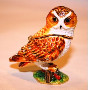 Juliana - Treasured Trinkets LITTLE OWL Size: H6 x W5 x D3 cms  A range of heavy, enamelled metal, ornamental trinket boxes made in the guise of animals, birds and other collectable pieces of memorabelia. Hand painted and decorated with small sparkling crystals, finished with gold plated edgings and hinged to open. Beautifully crafted with room to contain a small hidden treasure. Here is an excellent opportunity to gather a collection of inexpensive trinkets which will stand the test of time and can only appreciate in value.